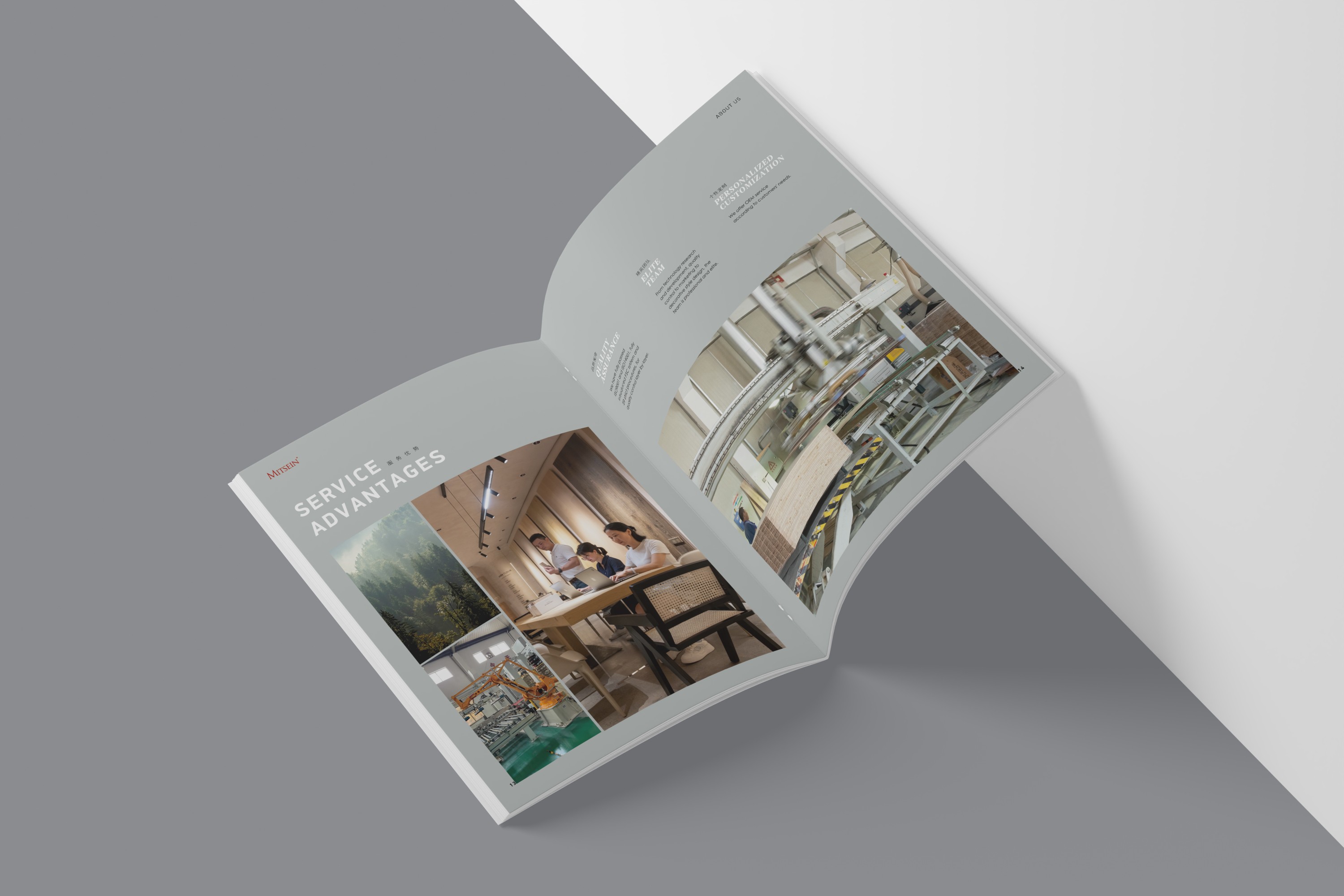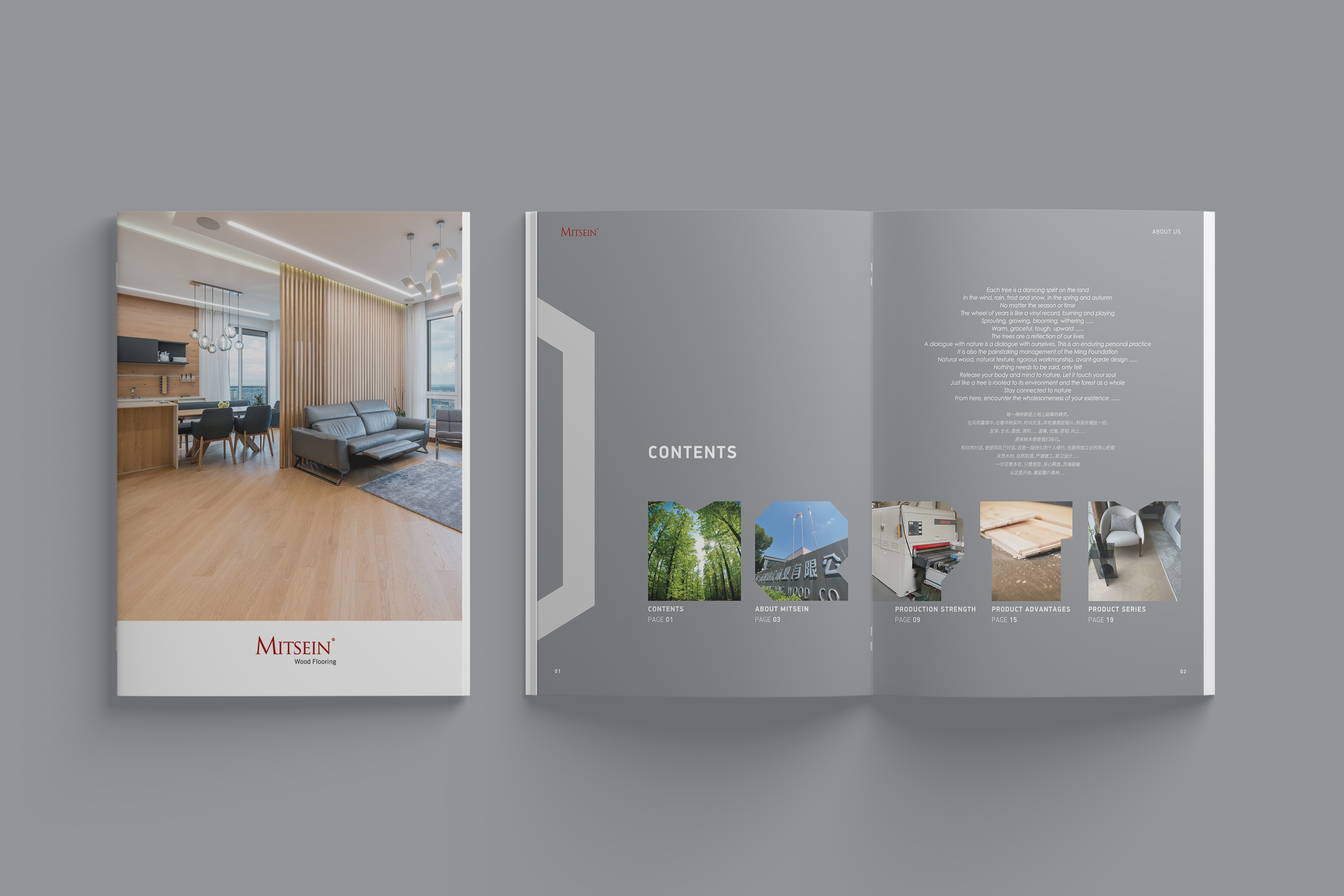 淺木色與灰色為主要色彩,既展現(xiàn)出明成木業(yè)的企業(yè)行業(yè)屬性,又具備自然環(huán)保的特征,色調(diào)大體一致,極具整體感。