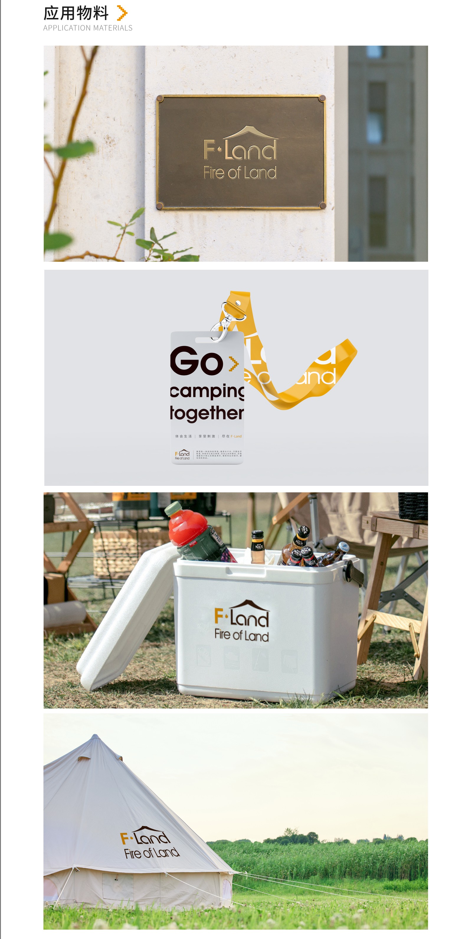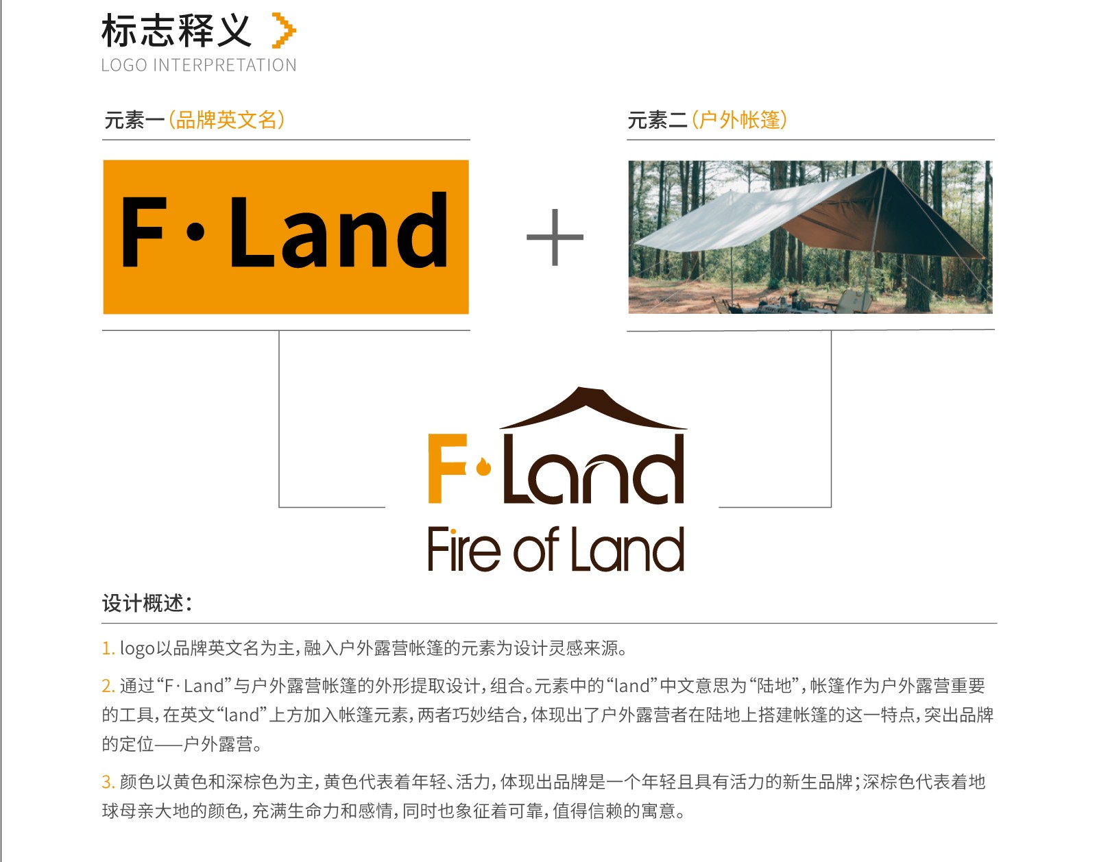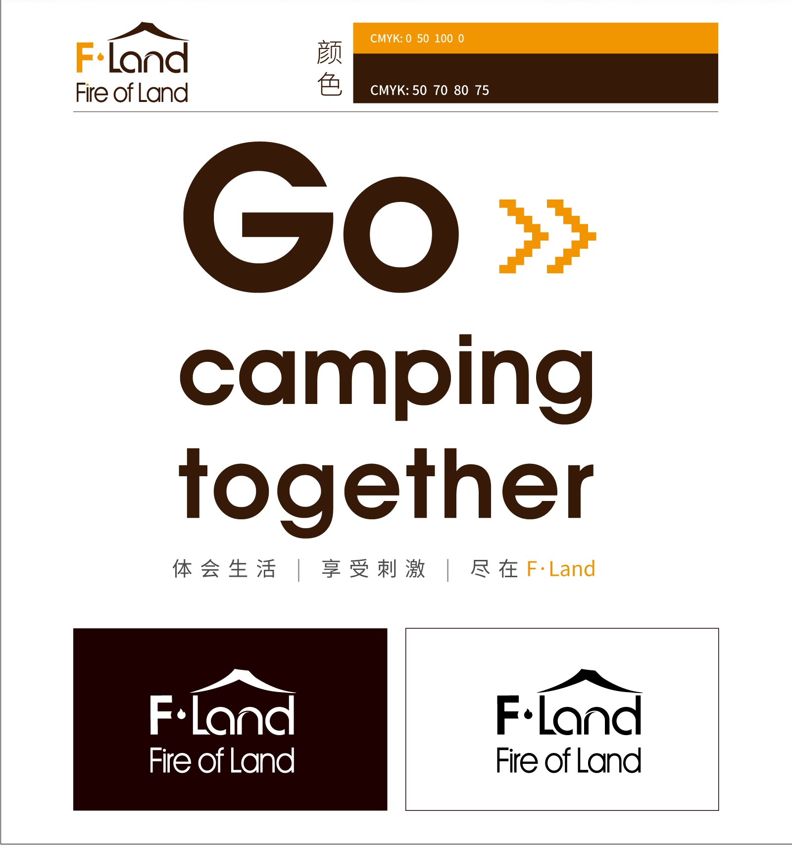 通過“F.Land"與戶外露營帳篷的外形提取設(shè)計(jì),組合。元素中的“l(fā)and"中文意思為“陸地”,帳篷作為戶外露營重要的工具,在英文“l(fā)and"上方加入帳篷元素,兩者巧妙結(jié)合,體現(xiàn)出了戶外露營者在陸地上搭建帳篷的這一特點(diǎn),突出品牌的定位一戶外露營。