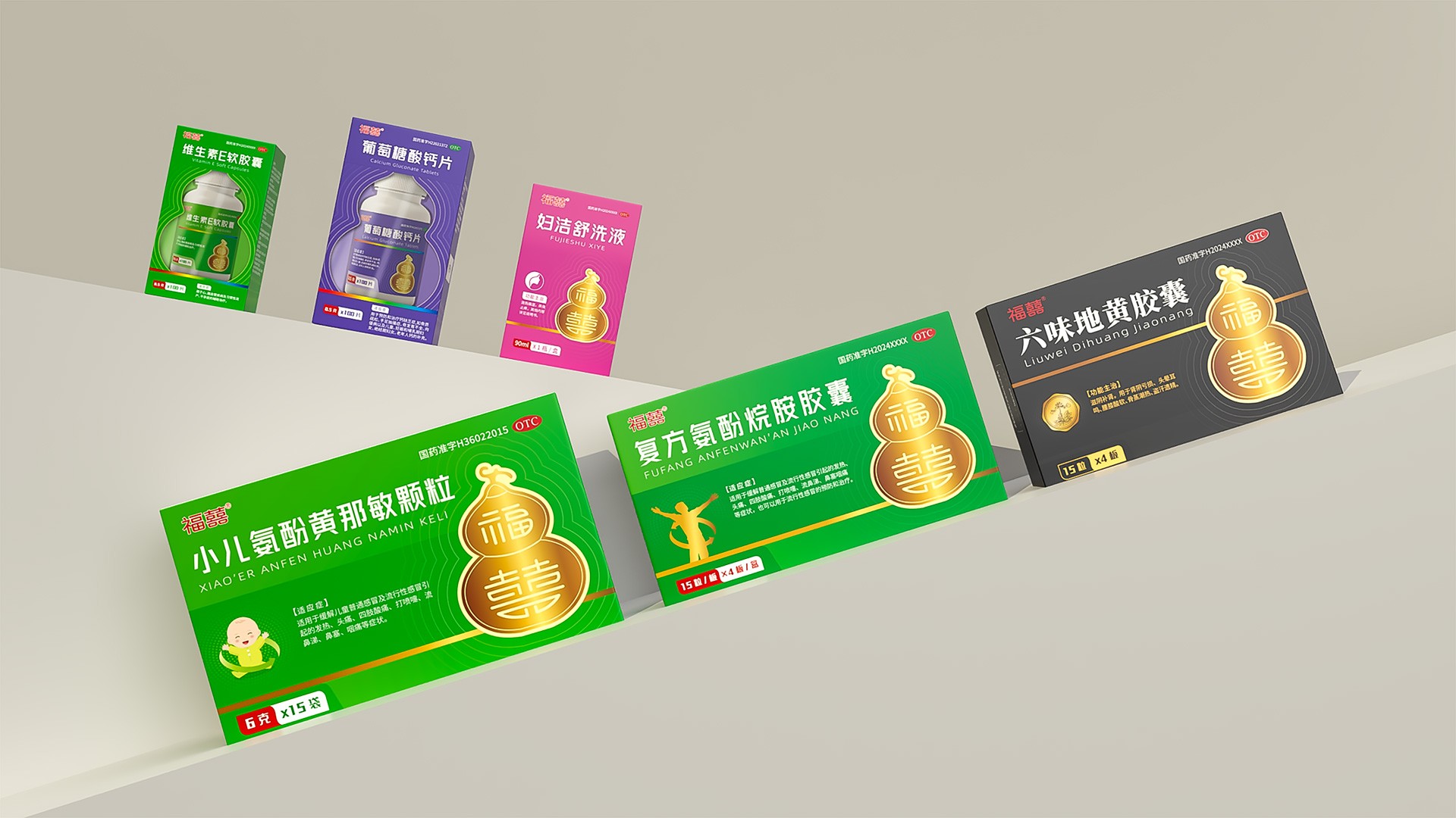 系列化產品包裝設計:針對福囍醫藥的核心產品線,進行了系統化的包裝設計。在確保合規性的基礎上,突出產品特色與賣點,通過統一的視覺語言提升產品陳列的整體美感與品牌檔次,助力終端銷售。